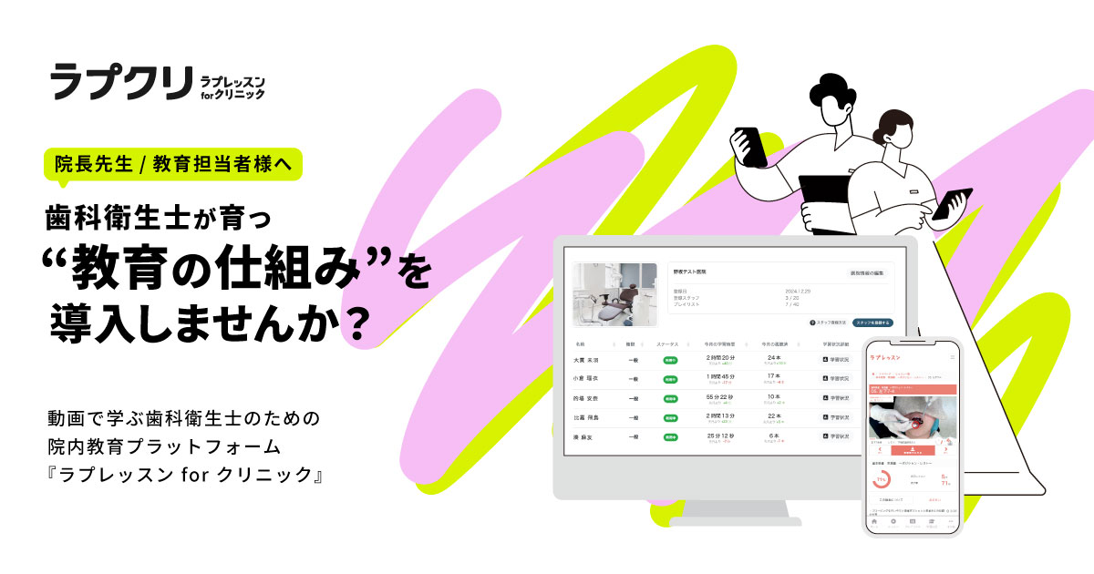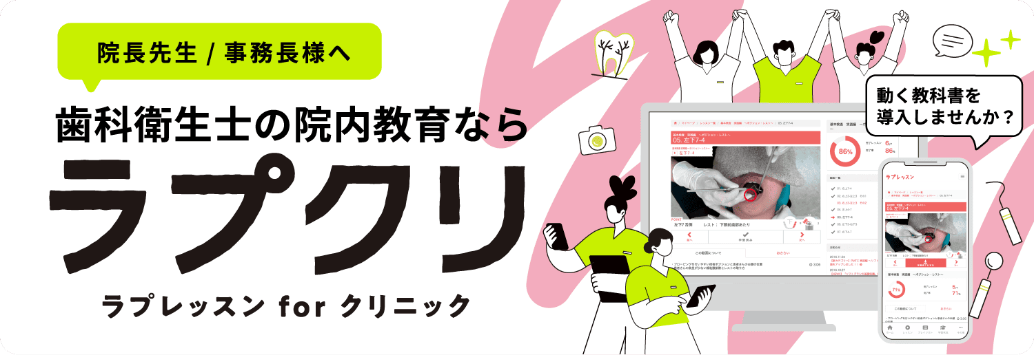ラプクリ限定で、お昼休みにサクッと学べる全4回のWebセミナーを開催! 【セミナー概要】 ・ポジショニング&ライティング(4/22 13:20-13:40) ・ミラーテクニック(5/13 13:20-13:40) ・エキスプローリング(6/10 13:20-13:40) ・プロービング(6/24 13:20-13:40) 臨床の基礎スキルを短時間で学べる絶好のチャンス! Zoom開催なので全国どこからでも参加OK! ▼詳しいことは下記のURLをクリック! https://la-precious.jp/skillup/